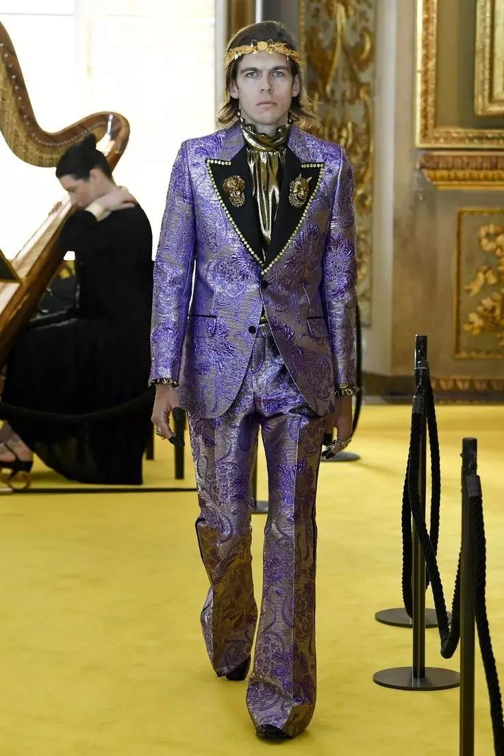 这场秀中,James所展示的是一件设计剪裁感十足的紫罗兰色锦缎西装,满满的70年代David Bowie复古风。James笑着说:“这和我平时的舞台风格并没有差距十万八千里嘛,我喜欢反传统男性时尚之道而行。每当我穿上这些演出服,就立马感觉自己变了一个人。”