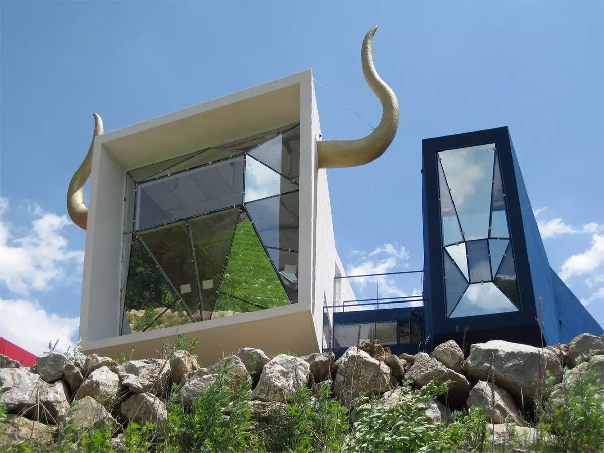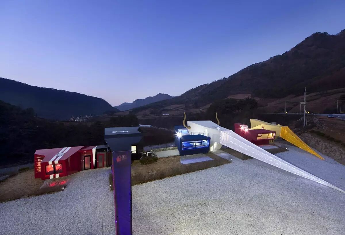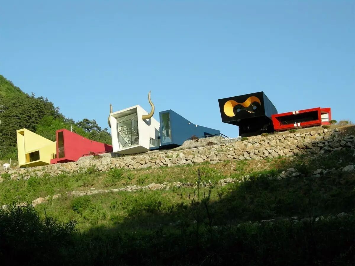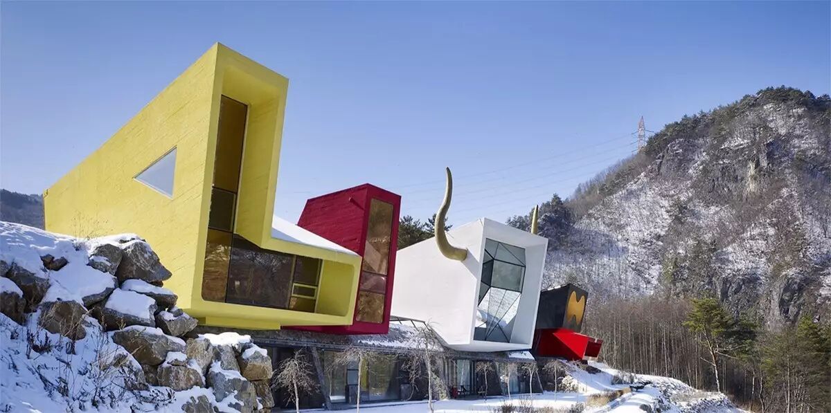 这几个五颜六色,屋顶上长牛角的奇怪房子,光看表面,完全看不出是为什么而设计的。如果告诉你这些房子是摇滚乐队拜托设计师设计的,你可能会觉得,似乎也不是不可以啊。