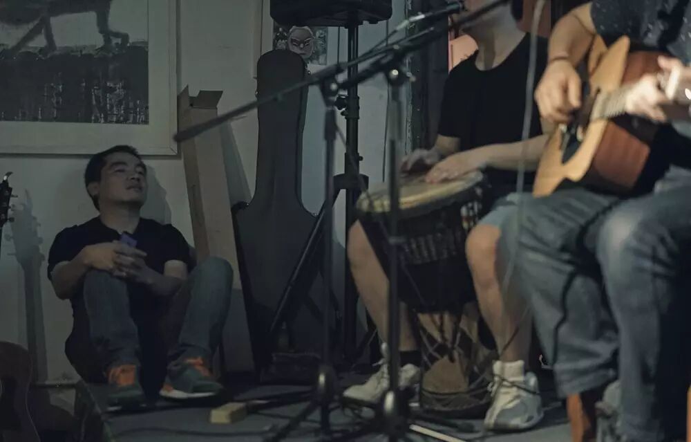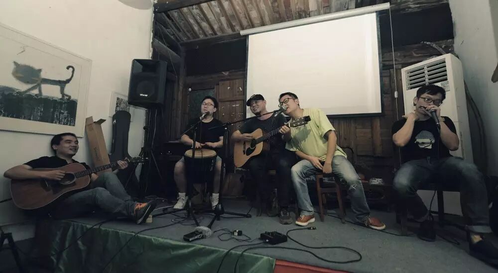 △ 左近(左1)、光头(左3)、鸭子(左4)大概民谣就是这样吧,左近靠在墙边弹着吉他,光头侧过身让鸭子唱几句。仿佛没有舞台,也没有音乐会
