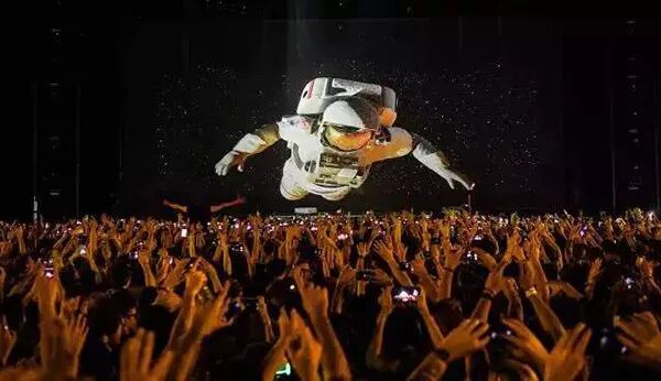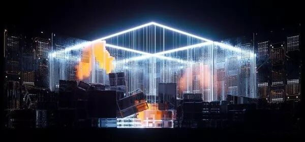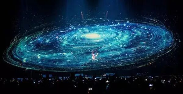Sershall及他的团队奢华打造。舞台设计成立方体形状,前面有一个28mm透视LED,透过中间的全息透明纱布可以清晰看到让人迷惑的全息投影,同时,一块12mm 4:1的宽屏LED围绕立方体,回放现场关键内容。现场所有的内容都是由Octane渲染器渲染出来的。