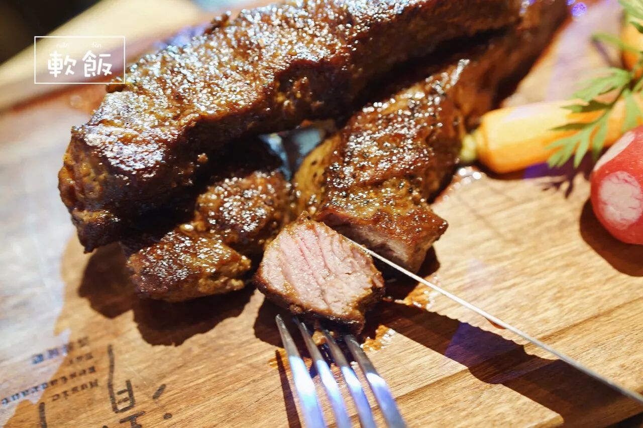 把牛排一块块切好,可以看到清晰的纹路,而且这份牛排超厚身,分量感人!这叫食肉兽怎么忍哪!!