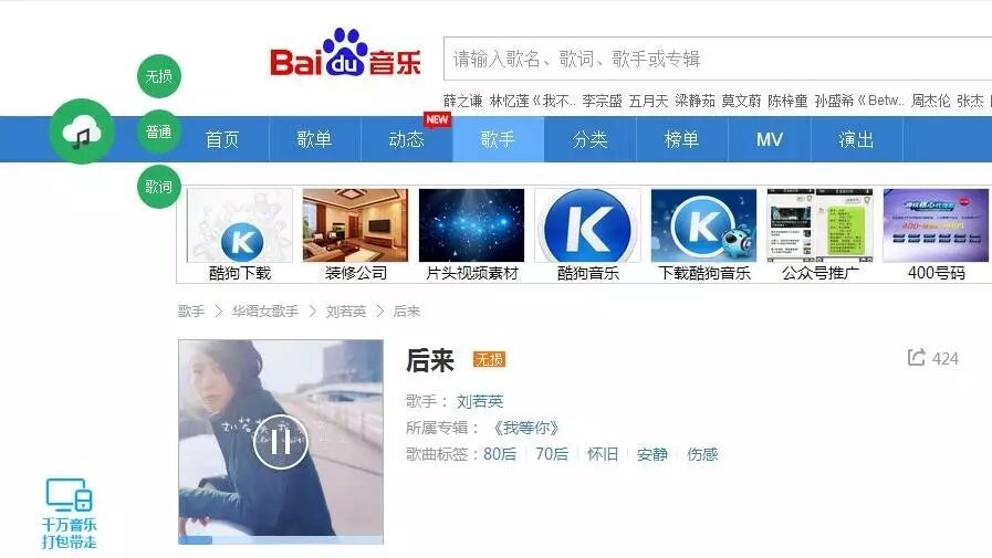 其他音乐网站没怎么关注,不知道哪些是会员专享歌曲,所以随便测试了几首。可以看到酷狗音乐这里没有出现插件图标,也不知道是不是它被测试太多次数还没缓过劲儿来。从百度音乐这张图可以看到网页上有一些广告,这也就是这款插件的不好之处,它需要取消浏览器的广告过滤才能使用,具体操作在后面安装教程里面讲。音乐下载不只是支持上面提到的音乐网站,还有音悦台、QQ音乐等更多网站等你发现。