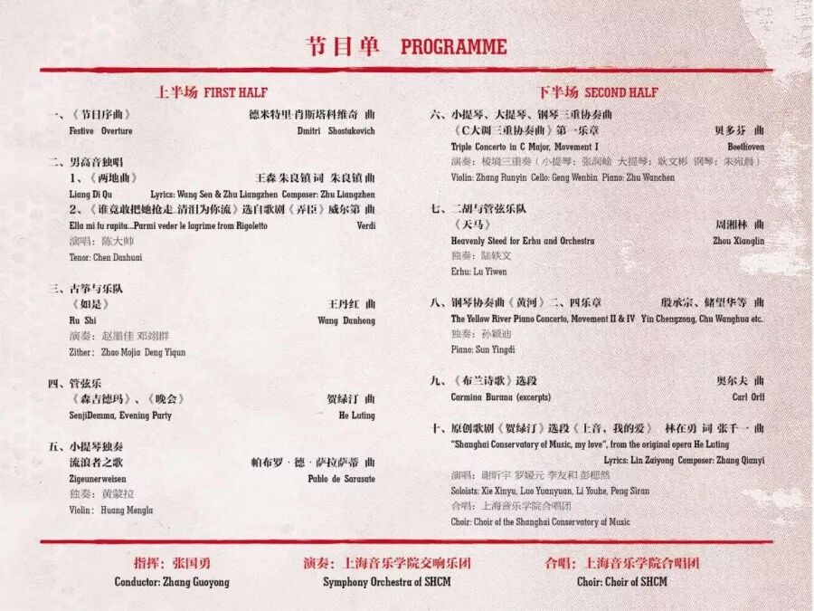 本次新年音乐会在选取上涵盖了中外许多耳熟能详的经典作品,如贺绿汀老院长所作的《晚会》《森吉德玛》,以及大家耳熟能详的钢琴协奏曲《黄河》《布兰诗歌》选段、《流浪者之歌》以及非常有节日氛围的肖斯塔科维奇《节日序曲》等一系列动听的乐曲。
