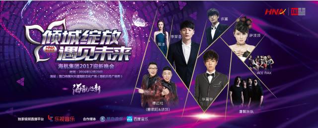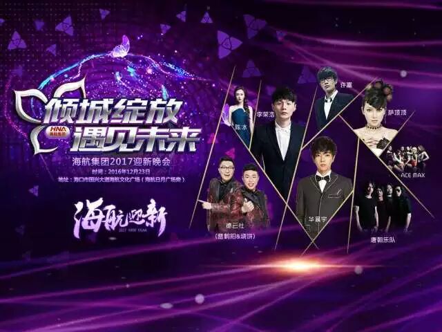 为庆祝海口建市90周年,回报海南社会和海南人民,进一步推动文化惠民活动深入,对外展示海南国际旅游岛建设成果,同时与海南人民共同欢度2017年的到来,海航集团将于2016年12月23日19:00-21:40,在海口市海航文化广场(海航日月广场旁)举办海航集团2017“倾城绽放·遇见未来”迎新晚会。