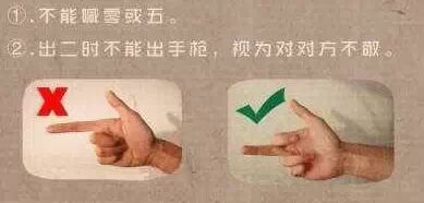 第二:不能出大拇指和食指的组合(貌似八)以及大拇指和小拇指的组合(貌似六),这样的组合被认为是不敬,更不能只出一个小拇指这是最忌的。