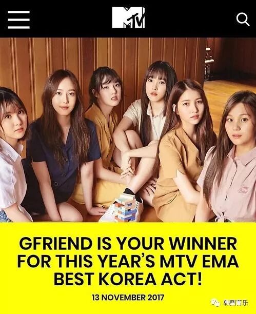据韩国经纪公司Source Music14日消息,女团GFRIEND当地时间12日在英国伦敦举行的“2017MTV欧洲音乐大奖”颁奖礼上荣获“最佳韩国艺人奖”(Best Korea Act)。“最佳韩国艺人奖”于2013年新设,由全球粉丝投票评选,此次首次由女团获得该奖项。Source Music表示,今年男团Highlight、Seventeen、Wanna One以及女团MAMAMOO和GFRIEND入围候选名单,最终GFRIEND获此殊荣。