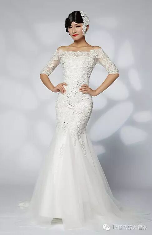 此款婚纱非常简洁,依身体曲线贴身剪裁的窄摆合身设计,不用衬裙。大多用丝质乔其纱、绉绸等具有极好下垂感的面料制成。在及膝或略低处放开裙摆的鱼尾式婚纱是此款婚纱中最常见的变形版。