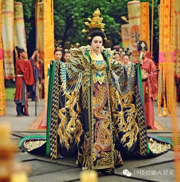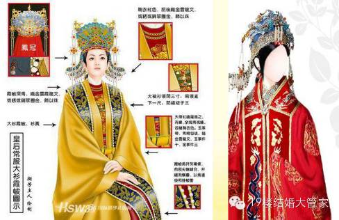 汉代以前大多是周制婚礼,辣个时候出嫁时穿得都是玄黑色和黄色的婚礼服,象征天地的神秘色彩。