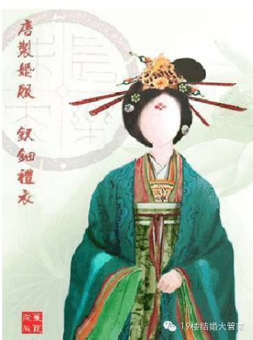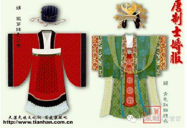 到了开放的唐代,妹纸的嫁衣也不像先秦辣么庄重,而是融入了一些热烈喜庆的色彩。男人穿绯红色,妹纸穿青绿色,有个成语叫“红男绿女”,出处就在这里,涨姿势了吧!