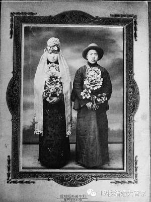 由于西方文化的渗入,那个时期的新娘出嫁有穿西式婚纱的也有穿中式旗袍的。甚至还有穿着中式婚服,却头戴西式头纱的“混搭风”