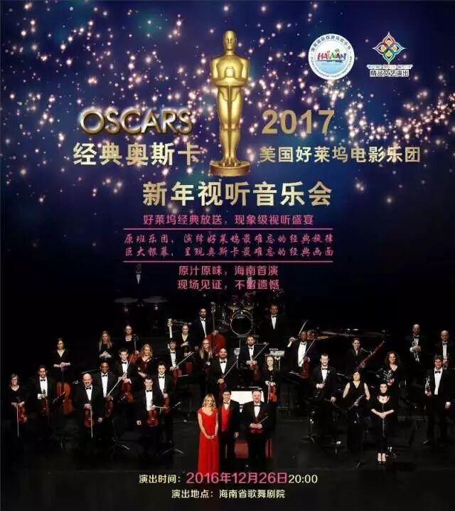 12月26日,风靡全球的二十多年的美国好莱坞电影乐团首登海口。该乐团用精彩剪辑的画面与优美音乐视听同步的极强观赏性、幽默和愉悦的演出形式,为全海南的观众们带来耳目一新的经典奥斯卡的新年视听音乐会
