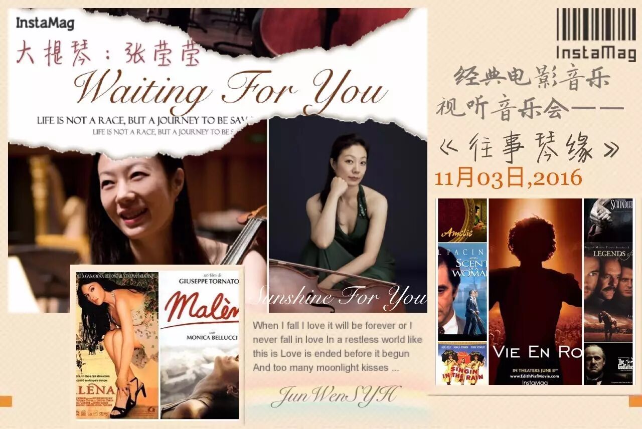 《往事琴缘——经典电影音乐视听音乐会》将于2016年11月3日晚20点在昆明春城剧院隆重上演,来自中国国家交响乐团的大提琴演奏家张莹莹、武汉音乐学院钢琴演奏家杨晓勇,将携手昆明聂耳交响乐团室内乐团为大家带来一场视听盛宴,优美的旋律配上银幕里播放的一幕幕经典电影片段,这样极致视、听感受你又怎可错过呢?