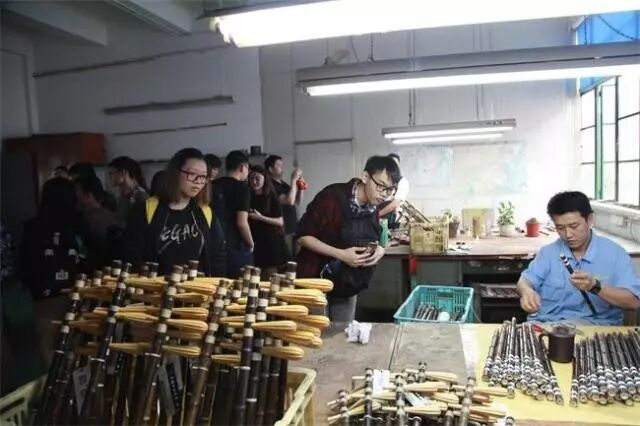 在民族乐器陈列馆,乐团成员们了解了上海民族乐器制作行业半个多世纪的发展历程,欣赏了展现中国民族乐器数千年历史文化的仿古、时尚、微型、精品、创新等系列的民族乐器。在生产车间,乐团成员们近距离观察二胡、笛子、箫等民族乐器制作技艺的同时,也不失时机地与制作师傅进行交流,咨询乐器制作、保养等方面的知识,让自己更加了解手中的乐器。在参观“张建平技能大师工作室”期间,乐团成员们对民族低音拉弦乐器颇感兴趣,纷纷与高级技师张建平进行了交流。