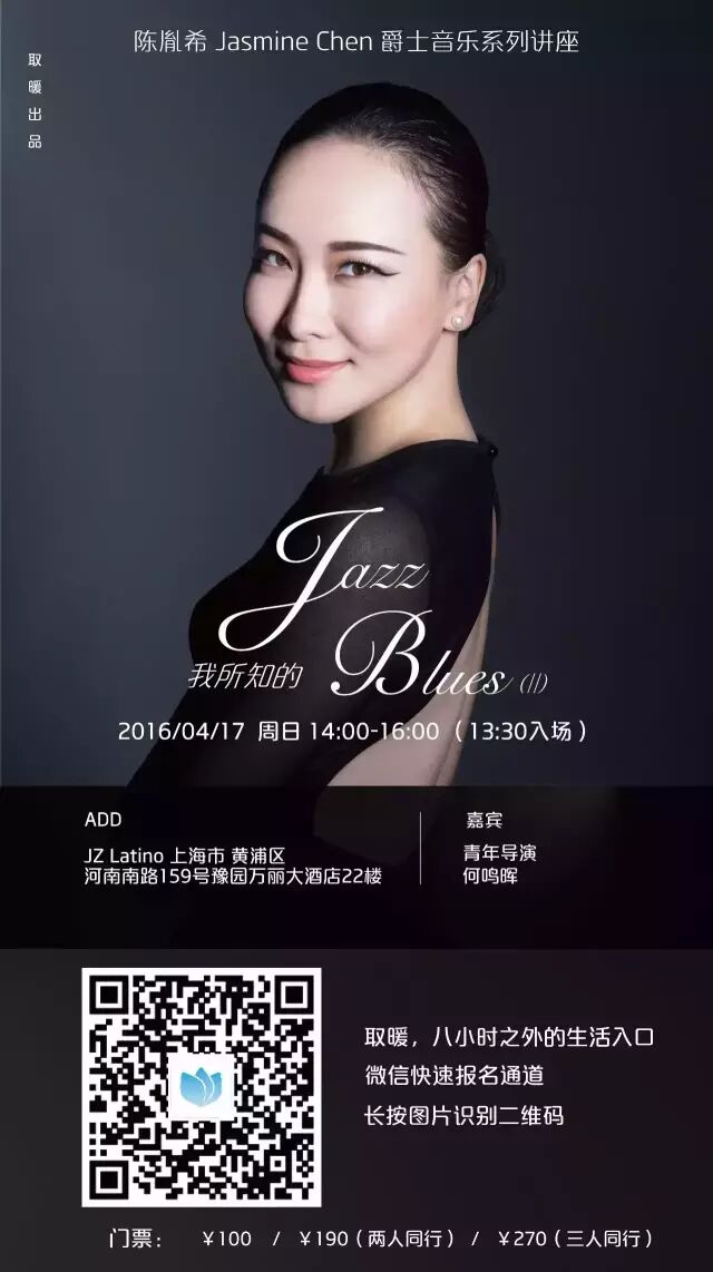4月17日(周日)下午2点,陈胤希(Jasmine Chen)二度携手取暖APP,带着对爵士布鲁斯最新的思考,全方位解读一个绝不狭隘的爵士布鲁斯。