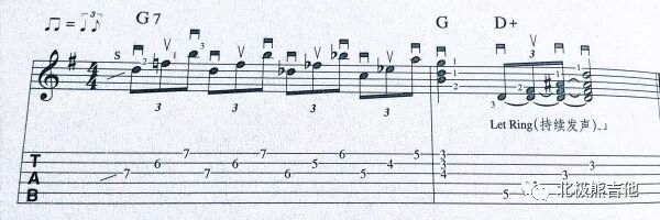 弹分解和弦,弹单音和直接弹和弦感觉完全不同,冲击感不强但是更细腻。下面的例子第一个小节就是上个例子第一小节的和弦分解,第二小节第一拍是G和弦,然后接了五级和弦D+(增和弦:1,3,#5)。没有必要纠结为什么不弹D7或者D和弦的分解,增和弦只是营造一种更不稳定甚至诡异的氛围,如果你不喜欢,换成D7的分解也可以。