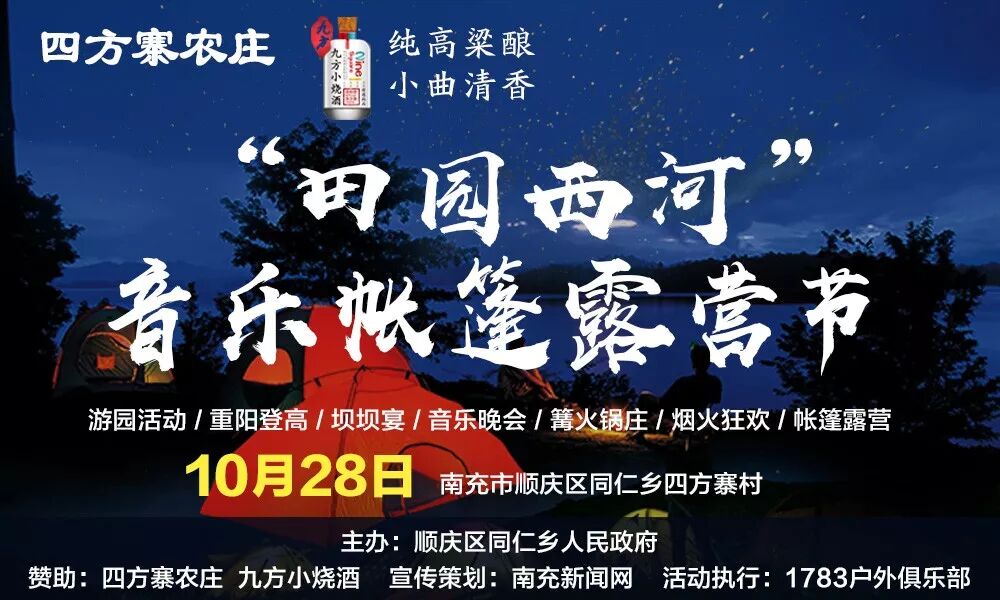 由同仁乡人民政府主办,四方寨农庄及九方小烧酒赞助支持的首届“田园西河”之四方寨风情音乐帐篷露营节,10月28日在顺庆区同仁乡四方寨农庄举办,当天,2000多人在这里欢聚一堂。