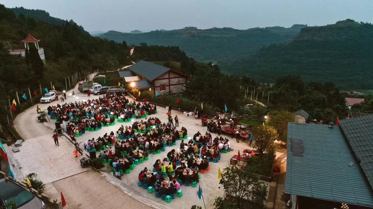 两个多小时的欢乐游园活动后,下午6时,坝坝宴正式开始;活动领队挥舞着旗帜,带领数百人齐声高唱《开饭歌》,场面尤为壮观。一道道端上餐桌的乡村美味让人垂涎欲滴。游客们迫不及待地拿起筷子,品尝着“九斗碗”的佳肴。