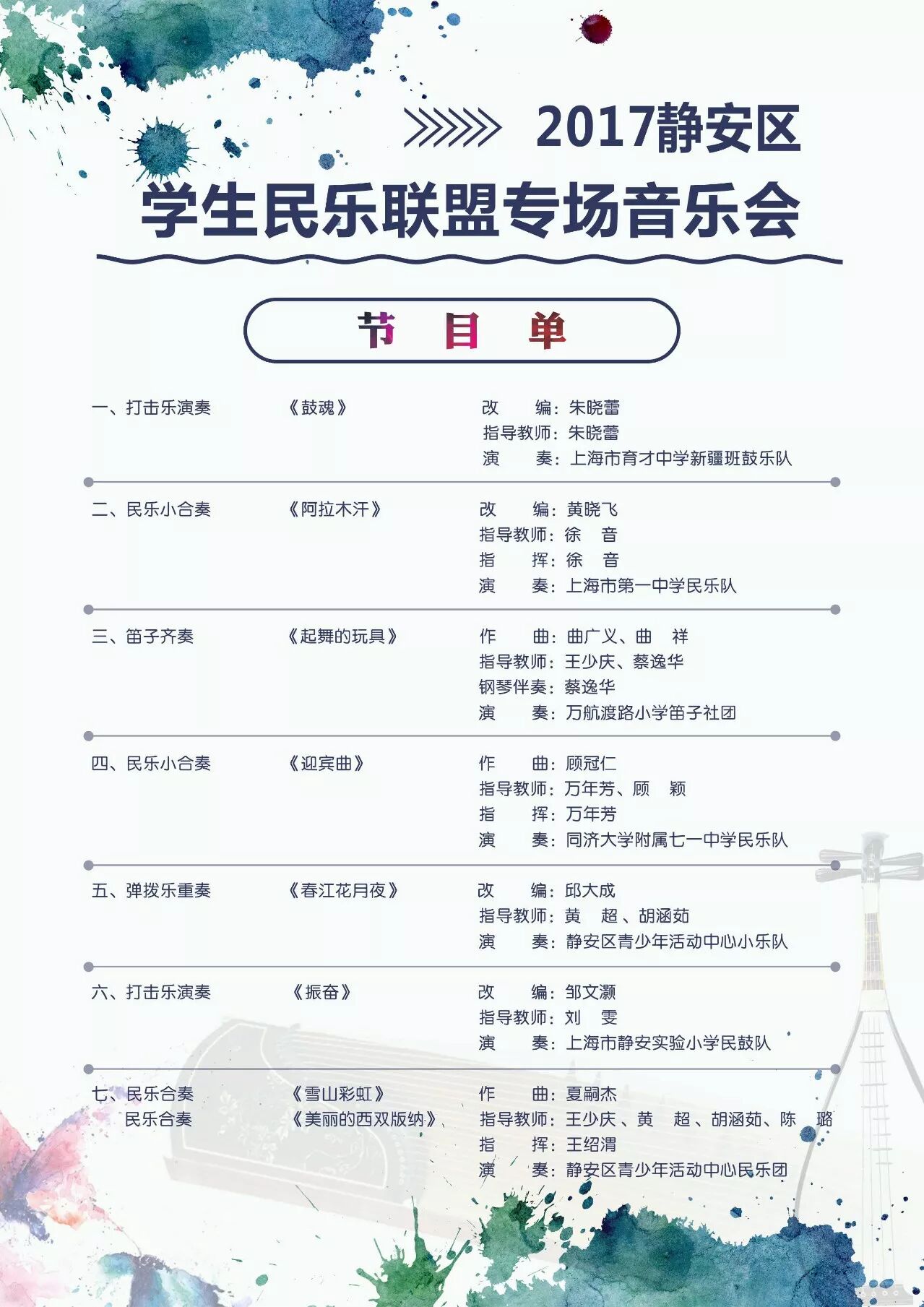 本场音乐会是静安区青少年活动中心民乐工作室和静安区民乐联合教研组的成果展示,区域内五所学校共同参与,集合了活动中心民乐团、上海市第一中学民乐队、同济大学附属第一中学民乐队、上海市育才中学新疆班、上海市静安实验小学民鼓队以及万航渡路小学笛子社团,他们将带来非常精彩的演出,大家千万不要错过哦!