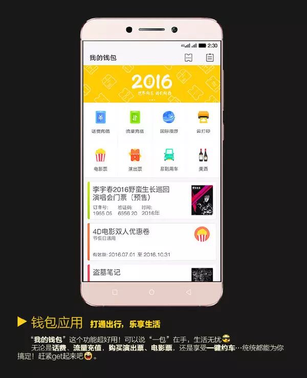 钱包应用的加入更能体现其生态的价值,无论是话费、流量的充值,电影票还是出行用车,统统为你搞定,强大吧