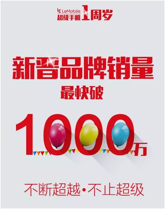 乐视手机从进入手机市场以来,便以一个颠覆者的形象存在,一个又一个生态词汇不断刷新我们的消费理念,乐视移动宣布超级手机2015年总销量超过400万台,也就是说从去年5月19日发售超级手机以来,仅7个月就实现了这一销量,可以说乐视完全颠覆了整个市场,乐1s推出两个月即实现单品单月销量超100万台,创造了新晋品牌最快单月单品破百万纪录。如今乐视超级手机一周年之际,其总销量突破1000万台,再次刷新纪录。