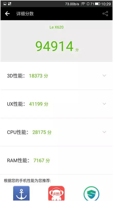 安兔兔跑分94914分,相当犀利的。这里温馨提示下用户,日前有乐迷朋友说自家的乐2跑分只有6万分左右, 这是怎么回事,是不是买到假货了哇?其实不然,这是因为新机出厂系统未优化完成,乐迷朋友们只需更新到最新系统就OK啦!