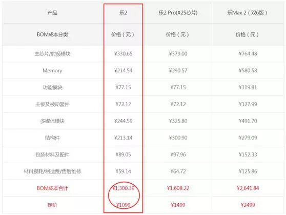 好啦,通过以上的对比我们发现,Pro 6在配置上的确比乐2更有优势,但二者相差也并不大,然而在价格上两者就却有着天壤之别,乐2售价1099元,Pro 6 32G版本2499,其相差1400元,可以说Pro 6的毛利比重相当大。