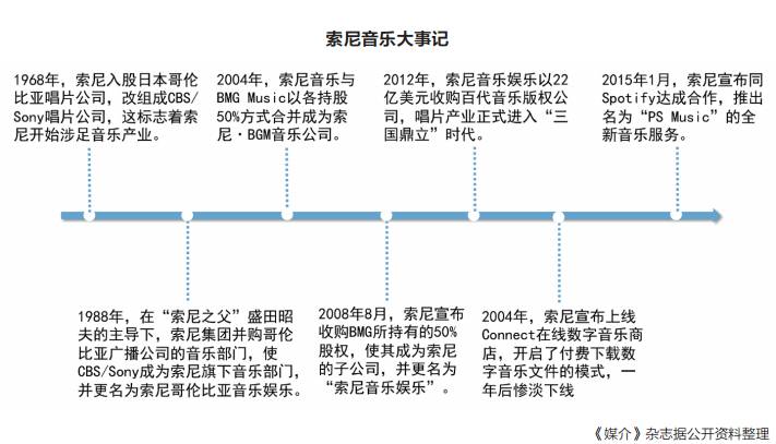 首先是通过版权分销获得大笔收益。在音乐内容的把控方面,传统唱片公司仍然具有不可替代的优势,这也成为唱片巨头们同流媒体谈判的最大筹码。拥有全球最大音乐内容库的索尼音乐在谈判桌上可谓占尽优势。据美国科技媒体techdirt日前报道,在欧美音乐流媒体创造的收入中,唱片公司是最大的受益者:唱片公司能够从Spotify和Deezer创造的流媒体音乐营收中拿到45.6%的分成。除了获取大笔版权分销收入之外,唱片公司的强势还体现在其与流媒体签订的合约之中。2015年5月,美国科技网站The Verge曝光了索尼音乐和Spotify关于版权协商的合同条款,合约中规定索尼音乐享有同其他唱片公司相同的优惠待遇且索尼音乐可以在日后视合作情况修改内容条款,而Spotify除了仅5000万美金的预付款之外,还要依照音乐的点播量占比向索尼音乐支付版权费用。除此之外,在与索尼音乐的合同期内,Spotify 需要拿出价值900万美金的广告库存免费赠与索尼音乐,以供索尼音乐宣传自家歌手或歌曲,索尼音乐也有权力把售卖该广告且价格自定。此项“不平等条约”一经曝光即在业界引起轩然大波,一时之间传统唱片公司的强势地位令人们唏嘘不已。在中国大陆,索尼选择了腾讯旗下的QQ音乐作为其数字音乐音频内容战略合作及版权分销合作伙伴。依据双方在2014年签订的协议,QQ音乐将负责索尼音乐在中国大陆地区的数字音乐版权推广、管理及分销业务。腾讯除了向索尼音乐之支付天价版权费用之外还会通过旗下热门的游戏、无线及社交平台在中国大陆推广索尼旗下中国及国际艺人,以及其优质音乐内容。拥有大量优质的索尼音乐在对于流媒体版权分发中占据上风,除了入账大笔版权费用之外,还获得了免费推广自家内容的机会,可谓名利双收。第二是通过资本介入,坐享流媒体红利。流媒体的不断发展给传统唱片行业敲响了警钟,虽然优质版权集中在唱片公司手中,但是用户的音乐获取习惯逐渐转移到流媒体之上。一味的版权分销虽然实现了短期的快速变现,但对于唱片公司来说无疑是杀鸡取卵,无形之中,流媒体逐渐壮大而唱片公司则转而式微。对此,索尼采用资本运作的方式入股流媒体,坐享其发展红利。2016年3月,索尼音乐与美国音乐流媒体SoundCloud达成授权合作,除了一系列版权合作之外。索尼音乐还战略入股SoundCloud,并被邀请参与SoundCloud的下一轮融资。除此之外,索尼音乐还联合华纳音乐和环球音乐入股spotify,并持有期15%股份,一旦这家瑞典的流媒体上市,以索尼为首的三家唱片公司将会入账10亿美金。与所有国际传媒巨头一样,索尼的全球化拓展步伐从未止步。从体量而言,绝大部分流媒体音乐机构都无法在这个角度与索尼音乐这样的巨头相抗衡。所以,在数字音乐市场中,索尼音乐的另一大优势就是能够持续开拓相对蓝海的音乐市场。2016年年初,索尼音乐在非洲关键区域和关键城市设立了一批办事处作为其扩大非洲业务长期战略的一部分,其在尼日利亚拉各斯的办事处已经成为索尼在西非地区展开业务的新枢纽;除此之外,索尼还与肯尼亚最大的移动网络运营商,拥有1000万彩铃订阅用户的Safaricom公司进行业务往来。作为以唱片业务起家的传统音乐公司,索尼在数字化的浪潮之下并没有被淘汰,而是在保留和调整唱片业务的同时积极拥抱数字媒体,在传统唱片面临寒冬之际实现了业绩上扬。所以,数字化音乐浪潮来袭,互联网化、互动化的市场需求虽然对传统音乐巨头提出了挑战,但只要寻找到合适的转型方向,巨头们仍然可以进击,仍然可以制霸。1968年3月,日本索尼公司入股日本哥伦比亚唱片公司,改组成CBS/Sony唱片公司,这标志着索尼开始涉足音乐产业。1988年1月,在“索尼之父”盛田昭夫的主导下,索尼陆续并购了哥伦比亚广播公司的电影与音乐部门,使CBS/Sony成为索尼旗下音乐部门,并更名为索尼哥伦比亚音乐娱乐(Sony Music),简称为“索尼音乐”,这也为索尼进行全方位的音乐经营成为传统唱片时代的三大巨头之一打下基础。在以“演歌路线”为中心的音乐行业,索尼成功地开拓出了“偶像路线”,并因此迅速成长起来。公司成立十周年之际,销售额已经窜升到业界前列。索尼哥伦比亚公司成立第一年的销售额是7亿日元,而到了1988年,年销售额已经突破1100亿日元,成为索尼集团“硬件和软件两个车轮同时运转”战略成功的典范。唱片如日中天的年代,全球音乐产业被五大唱片公司(索尼、华纳、环球、百代、BGM)垄断,而索尼通过母集团雄厚的资本力量逐渐成为了巨头中的王者。2004年11月,索尼音乐与媒体巨头博德曼旗下音乐部门BMG Music以各持股50%方式合并成为索尼•BGM音乐娱乐公司。2008年8月,索尼宣布收购BMG所持有的合资公司另50%股权,使其成为索尼的子公司,并更名为“索尼音乐娱乐”。至此,五大唱片公司并立的局面变为四大唱片公司。2012年,索尼音乐娱乐以22亿美元收购四大唱片公司之一的百代音乐版权公司(EMI Music Publishing),唱片产业正式进入“三国鼎立的局面”,即三大唱片公司并立的时代,而索尼也因此掌握了全球规模最大的音乐库。