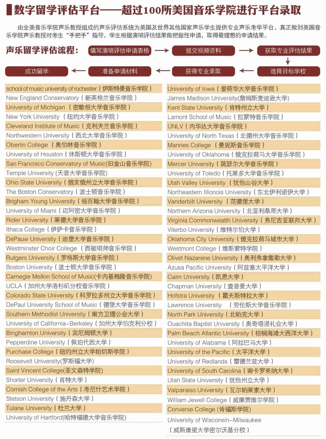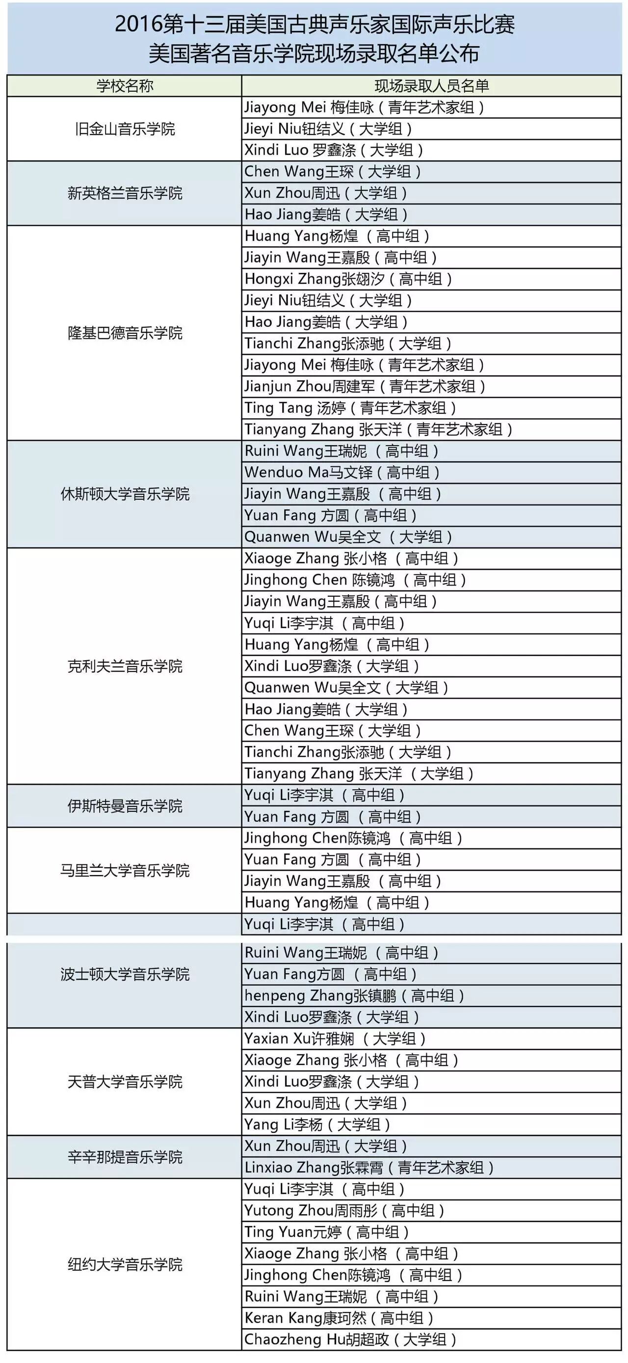 美国音乐学院录取通常分为两大部分:专业录取 (由专业教授通过面试考核共同决定) 和学院录取 (由录取办公室根据学生英语成绩、高中/大学成绩单、申请文书质量等决定)。由于在中国赛区所获得的现场专业录取为“条件性录取” (即专业录取,学生无需赴美进行专业面试),学生可在签订《服务合同》后,委托美国古典音乐表演艺术联合会完成文书写作及奖学金申请等后续相关申请工作。