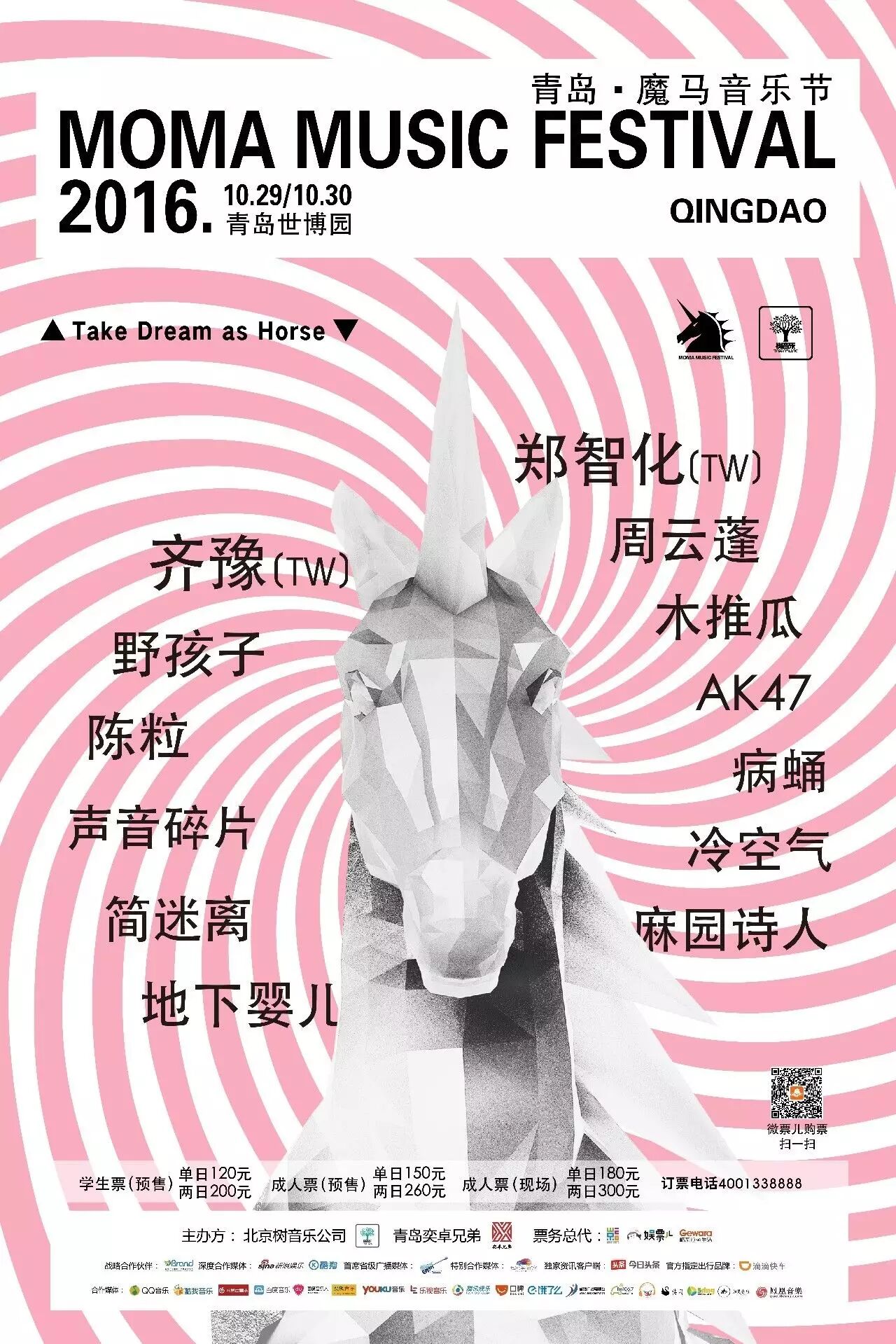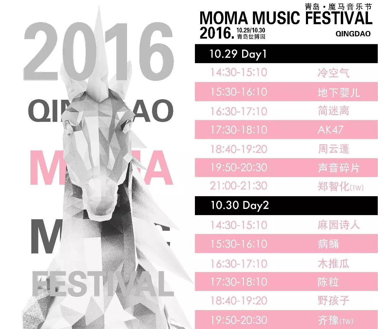 2016青岛魔马音乐节为期两天,重磅邀请了齐豫(TW)、郑智化(TW)、野孩子、周云蓬、陈粒、木推瓜 、声音碎片、 AK47 、简迷离、病蛹、地下婴儿、冷空气、麻园诗人等知名音乐人及乐队加盟。