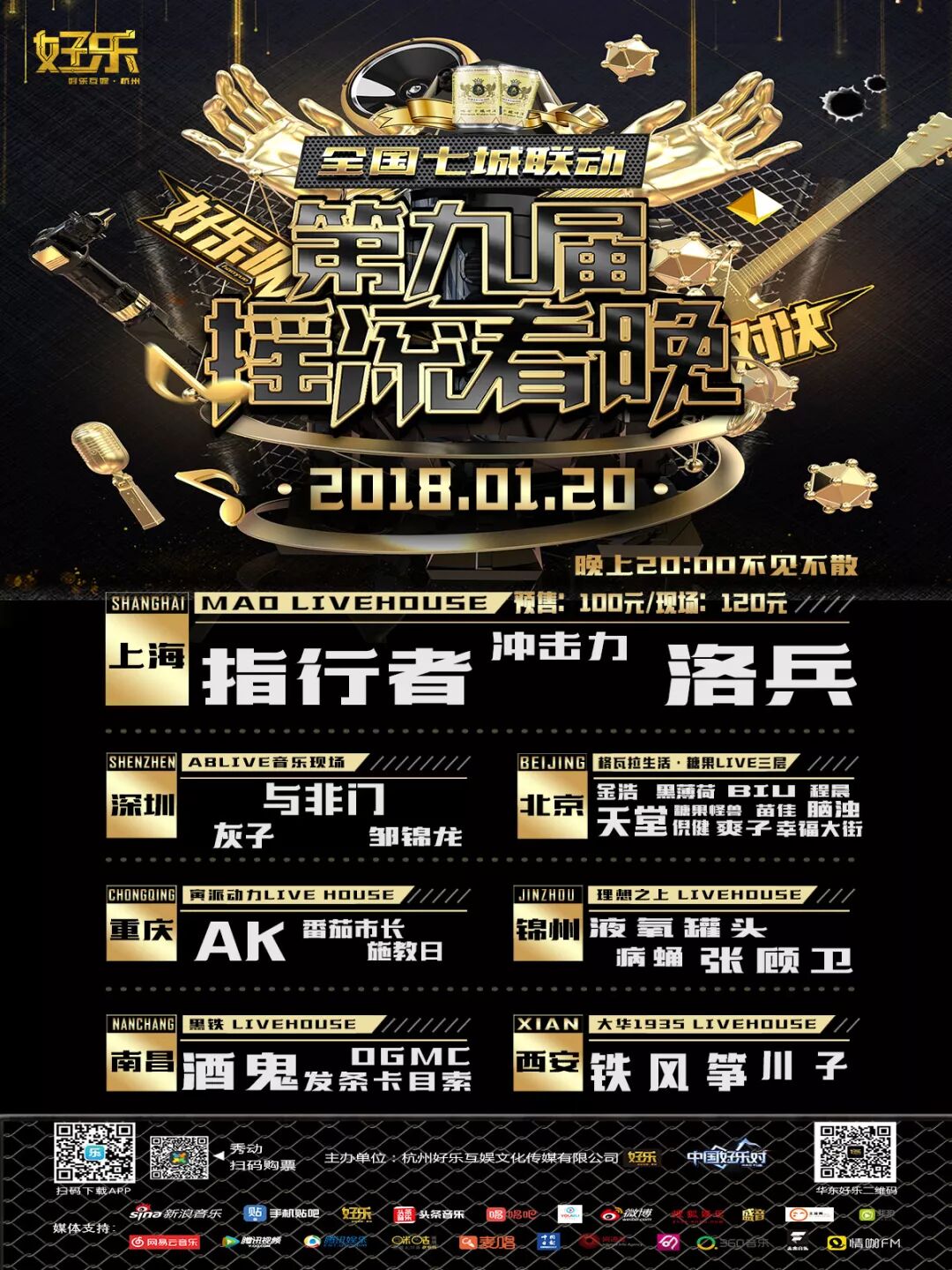 与此同时,好乐队终极对决&摇滚春晚于2018年1月20分别于北京、西安、南昌、深圳、锦州、上海、重庆七城联动,隔空battle,首届以乐队对战形式开启的音乐擂台赛,打造一场盛况空前的LIVE盛宴,我在现场等你!