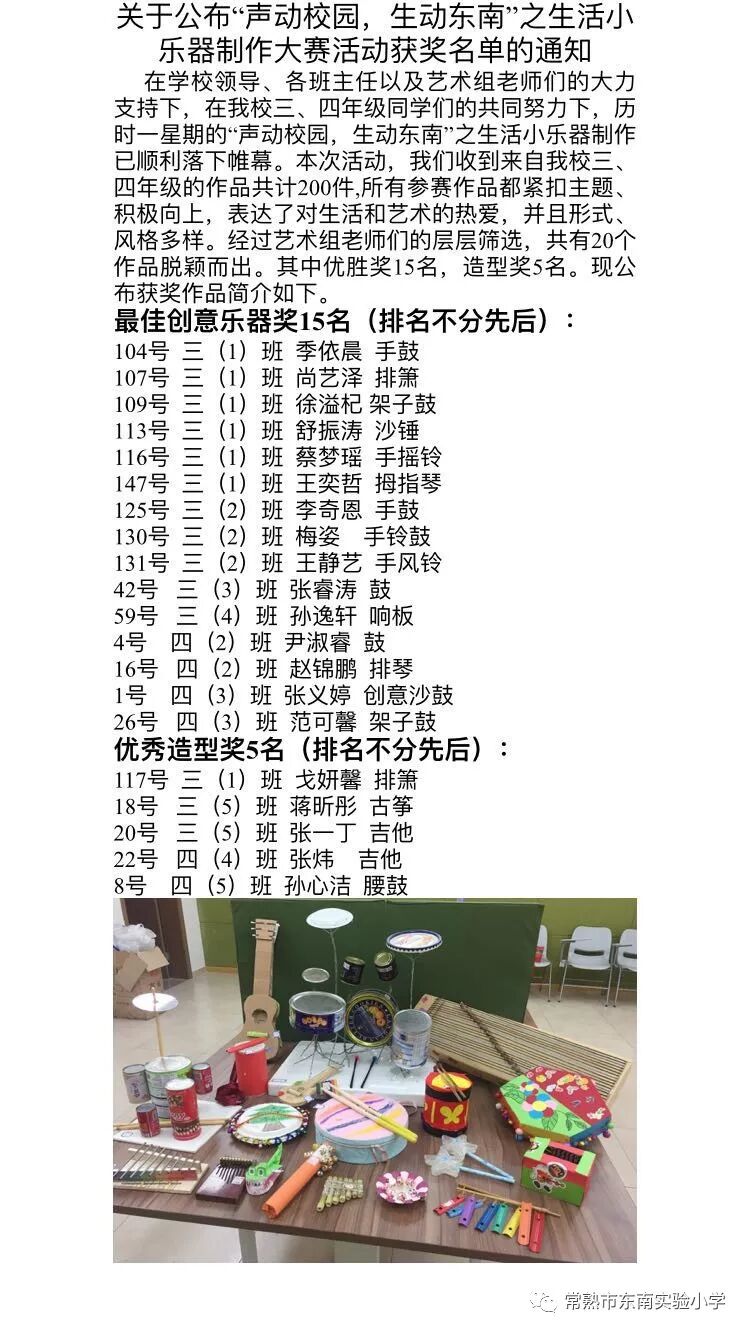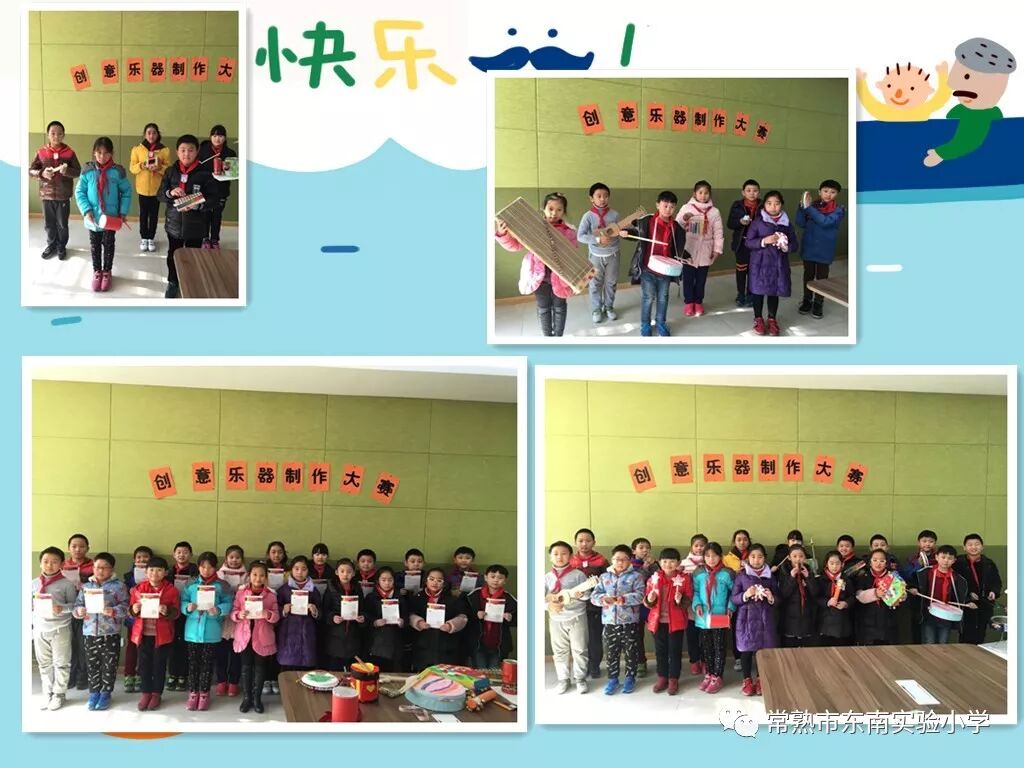 在学校领导、各班主任、家长以及艺术组老师们的大力支持下,在我校三、四年级同学们的共同努力下,音乐组“小乐器创意制作大赛”顺利落下帷幕。俗话说:“一千个读者就有一千个哈姆莱特”。音乐学科在培养学生的创新能力上有着得天独厚的条件。因为音乐艺术没有标准答案,同一首歌曲可以有多种演绎;同一个练习可能有多种答案;同一首乐曲可能有杜仲能够理解。于是我们就找了自制小乐器这样一个切入点:创意乐器制作大赛。希望能激发起学生发现生活中的新事物,运用已有的知识创造性地解决问题,以及培养学生科学探究的精神。