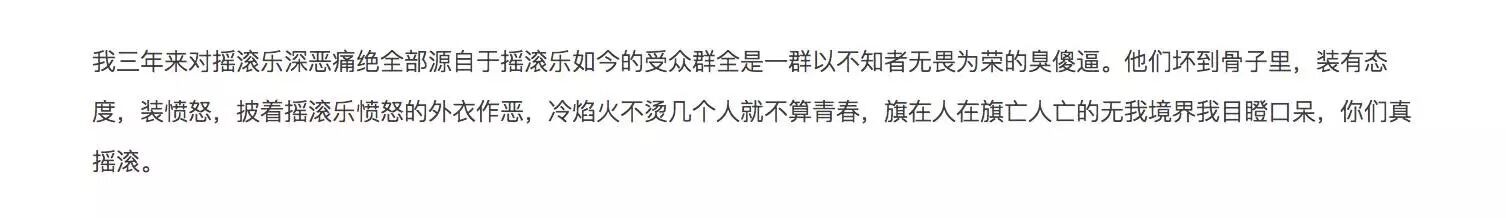 再后来,因为这群傻逼应运而生的自媒体(题外话,我恨自媒体,我自己也媒体沉浸在【我为国家造垃圾】的耻辱感里羞愤难当),尤其是具有舆论导向本该为大家普及一点正确的摇滚乐历史、知识,其实是能够让大家发现音乐美的自媒体,现在臭名昭著(或许还洋洋自得?)骂声一片。