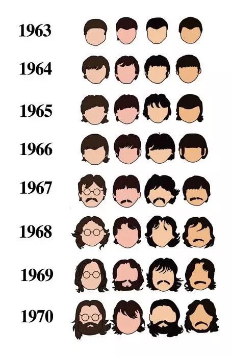 到 60 年代初期,披头士乐队和滚石乐队,在那时也是一副乖乖仔的形象。mop-top发型风靡一时,但是他们的风格也随着时间不断演变。