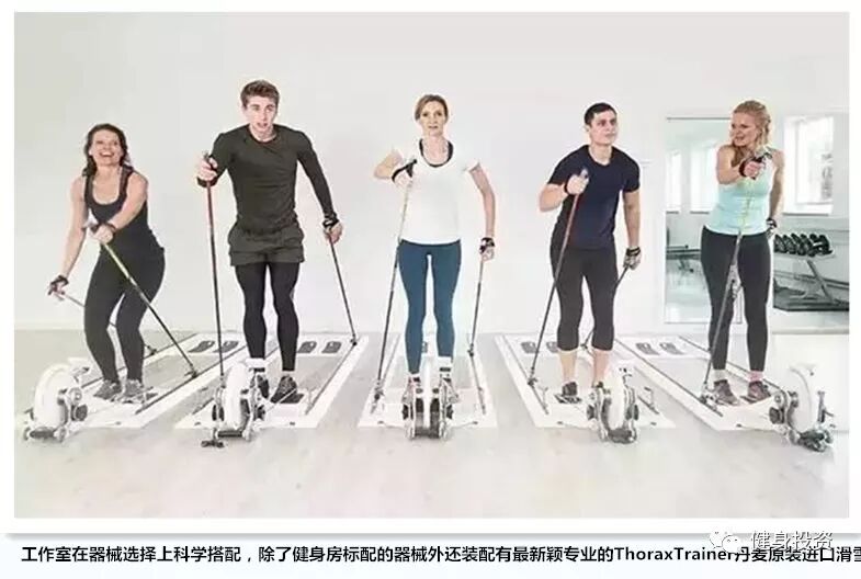 工作室在器械选择上科学搭配,除了健身房标配的器械外还装配有最新颖专业的ThoraxTrainer丹麦原装进口滑雪机。