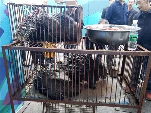 只见它们的背上长着长长的白刺,蹲在笼子里。