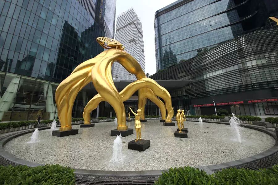 广州国际金融中心(又称西塔)雕塑“未来之门”是曾振伟的代表作之一。该设计模拟了人体肌肉交叉连贯的线条,将“力”的健美展露无遗。而“金蝉”“饮露而不食”,寓意品德高尚、守时守信,符合西塔的定位;孩童捕蝉则彰显天真、积极、勇敢的精神。曾振伟表示,“金蝉”与粤语的“金钱”谐音,它亦符合珠江新城的定位。