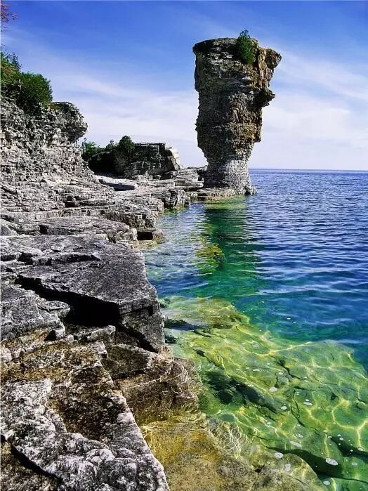 花瓶岛(Flowerpot Island)位于乔治亚湾,花瓶形状的柱子充满着凄美的传说,相传两座花瓶是一对敌对部落的情侣为了躲避追捕而化成的,所以这两个柱子被称为“永恒的恋人”。令人惋惜的是,其中一尊因为长期风吹雨淋,不堪重负而倒塌。剩下的一尊独自守望着这片充满传奇色彩的蔚蓝水域。