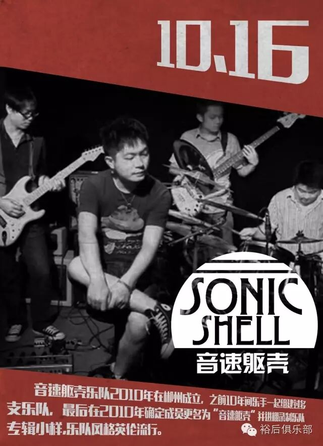 音速躯壳乐队(Sonic Shell)2010年在郴州成立,之前10年间乐手一起组建过多支乐队,最终在2010年确定成员更名为“音速躯壳”并进棚录制乐队专辑小样作品,《重复》《那些纯真》《无能的躯壳》《被遗忘的街》《离开》等乐队原创作品广受好评,是目前湘南地区摇滚乐队中作品比较成熟的一支乐队。乐队音乐风格以独立摇滚为主,并融合了金属,布鲁斯及一些民间音乐元素。目前乐队驻场于郴州裕后LIVEHOUSE.2015年,乐队将完成首张专辑小样的录制工作。乐队成员: