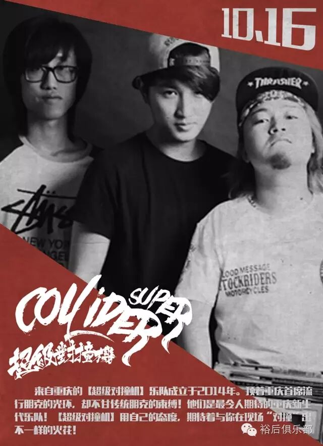 来自重庆的【超级对撞机】乐队成立于2014年。顶着重庆首席流行朋克的光环,却不甘传统朋克的束缚!他们是最令人期待的重庆新生代乐队!每一场演出必然拼尽全力,燃烧热血!用每一个音符敲打你的心脏!却也不忘带来直击灵魂深处的感动!2015,厚积薄发!被誉为希望之星的【超级对撞机】如同飓风般席卷整个重庆!无法掩盖的光芒,更不可预知的极限!【超级对撞机】用自己的态度,期待着与你在现场“对撞”出不一样的火花!