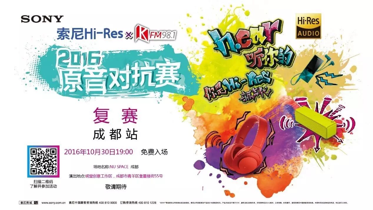 索尼Hi-Res X KFM981 2016原音对抗赛的复赛将于2016年10月30日19:00在成都市青羊区奎星楼街55号,NUSPACE举行。