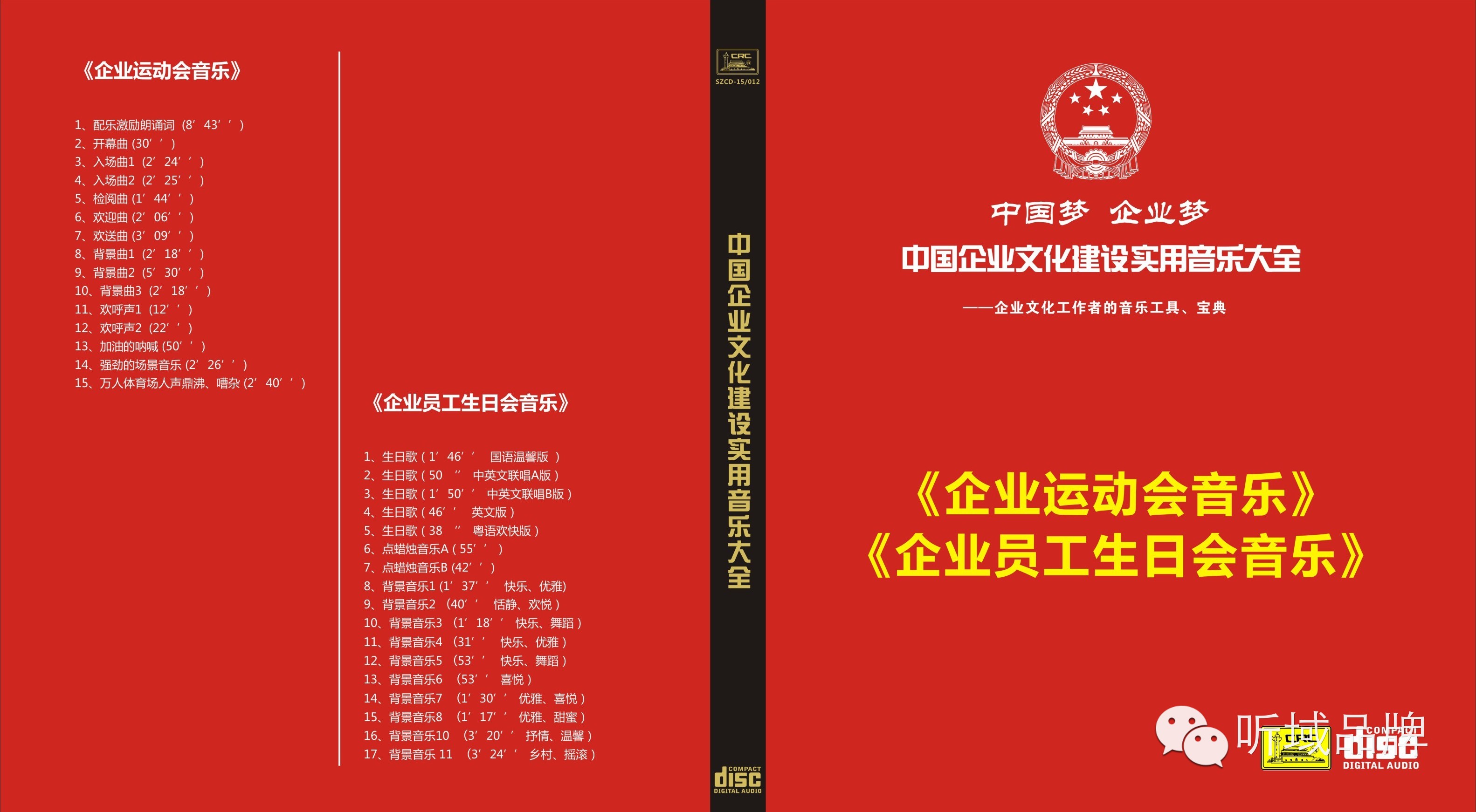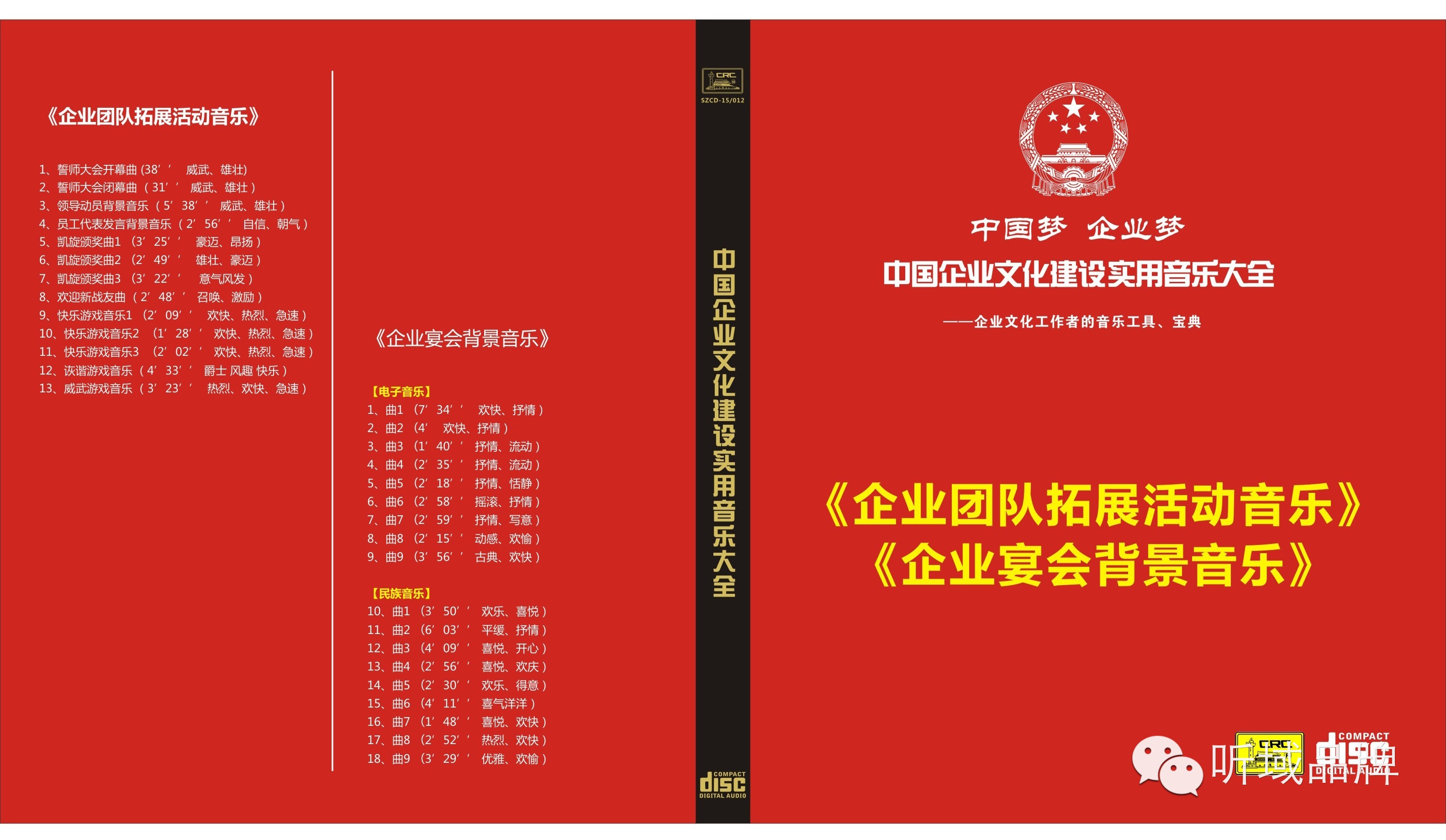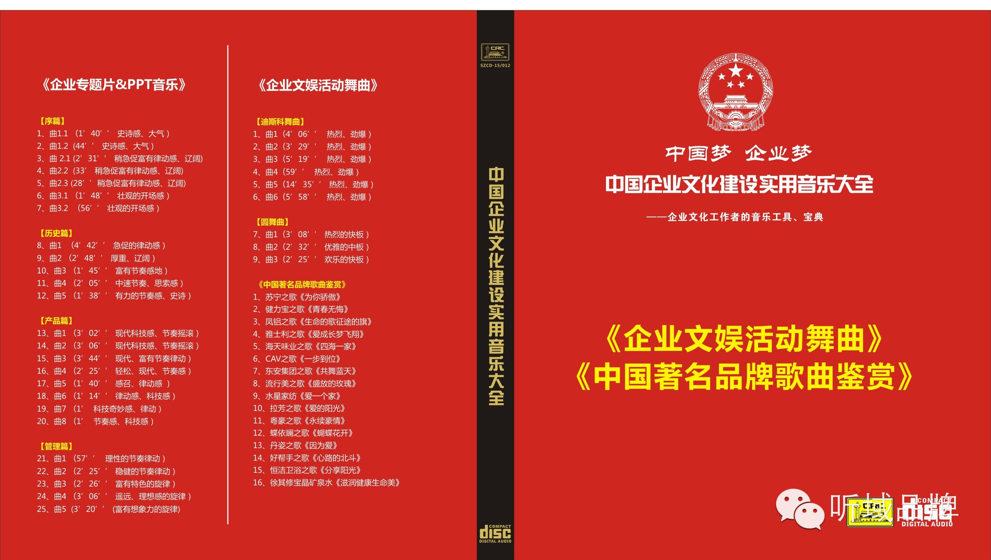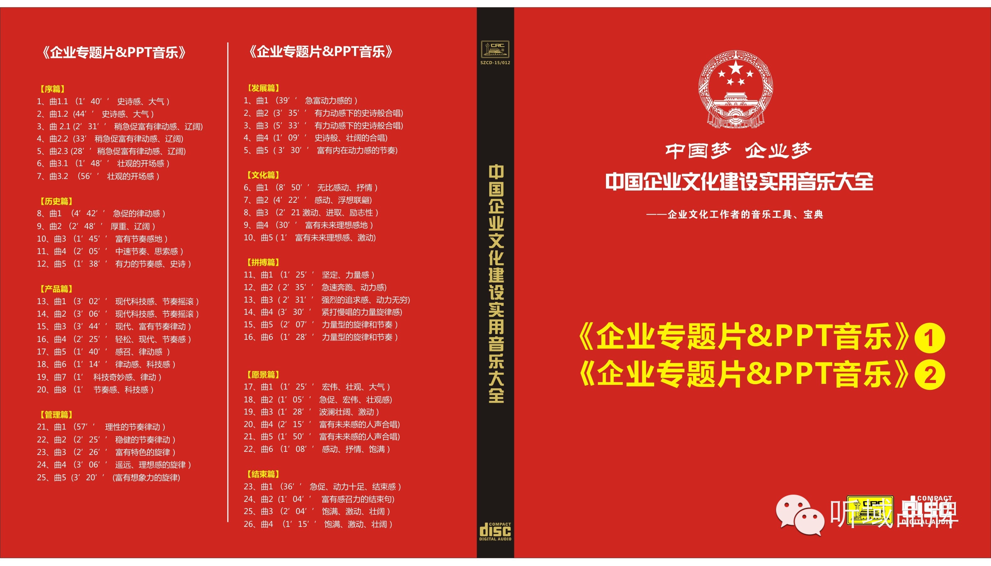 全套音乐共分十个部分(模块)组成,共11张精装CD光碟,包括:《企业大型会务音乐》、《企业培训音乐》、《企业运动会音乐》、《企业员工生日会音乐》、《企业团队拓展活动音乐》、《企业宴会背景音乐》、《企业专题片&PPT音乐》、《文娱活动舞曲音乐》、《中国优秀企业品牌歌曲鉴赏》、《中国著名企业听觉识别体系经典案例》。