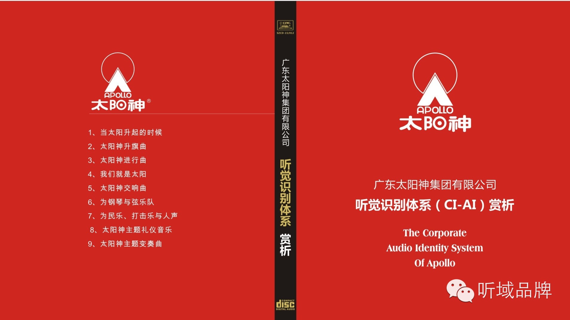 曾几何时,“当太阳升起的时候,我们的爱天长地久”,这首凝聚广东太阳神集团精神与文化的经典之歌,久唱不衰而成为一个时代的记忆。广东太阳神集团投资八百余万元,创作、录制了九首歌曲和音乐,构建了完整的“太阳神集团听觉识别体系”,并邀请中国中央乐团、中国军乐团等一批国家顶级乐团以及毛阿敏等著名歌唱家演奏、演唱,成为中国企业听觉形象体系建设与传播的优秀和成功典范。特别推荐。