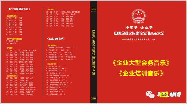 《中国企业文化建设实用音乐大全》是一套企业文化建设和日常运营中最常用的音乐工具,它的最大特点和价值是“定制性和专属性”,就是其中每个部分(模块)都是根据它的具体形式和内容而专门设计、编辑和定制录制的(如:《企业大型会务音乐》、《企业培训音乐》等等)。