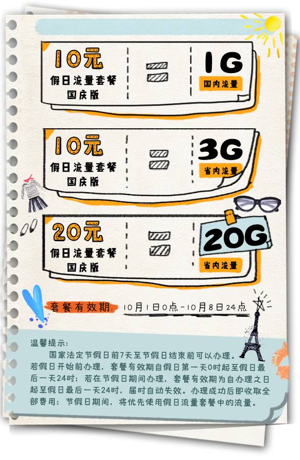 备注:假日流量包国庆版办理成功后,如若取消,将无法通过网上渠道或短信再次开通。