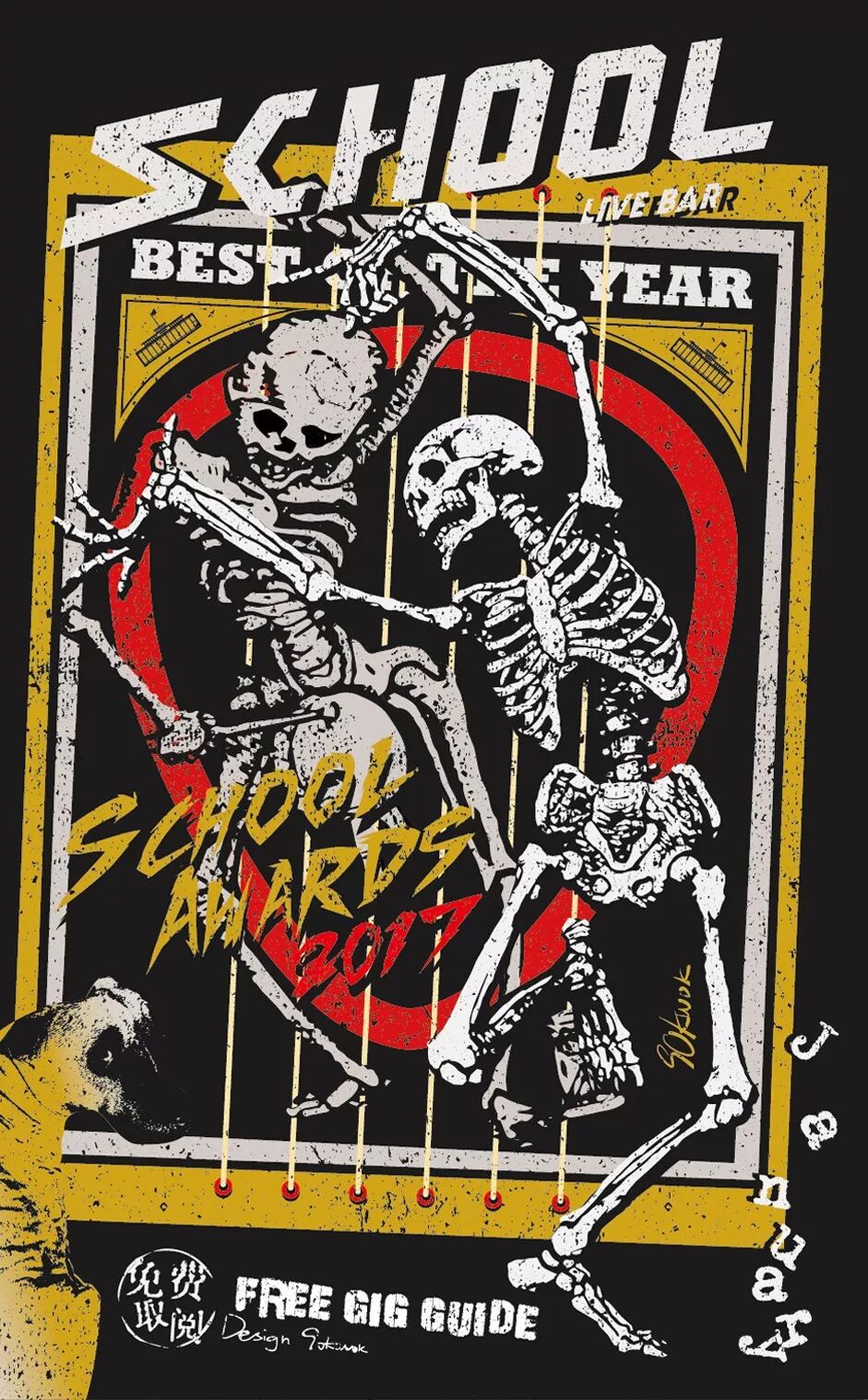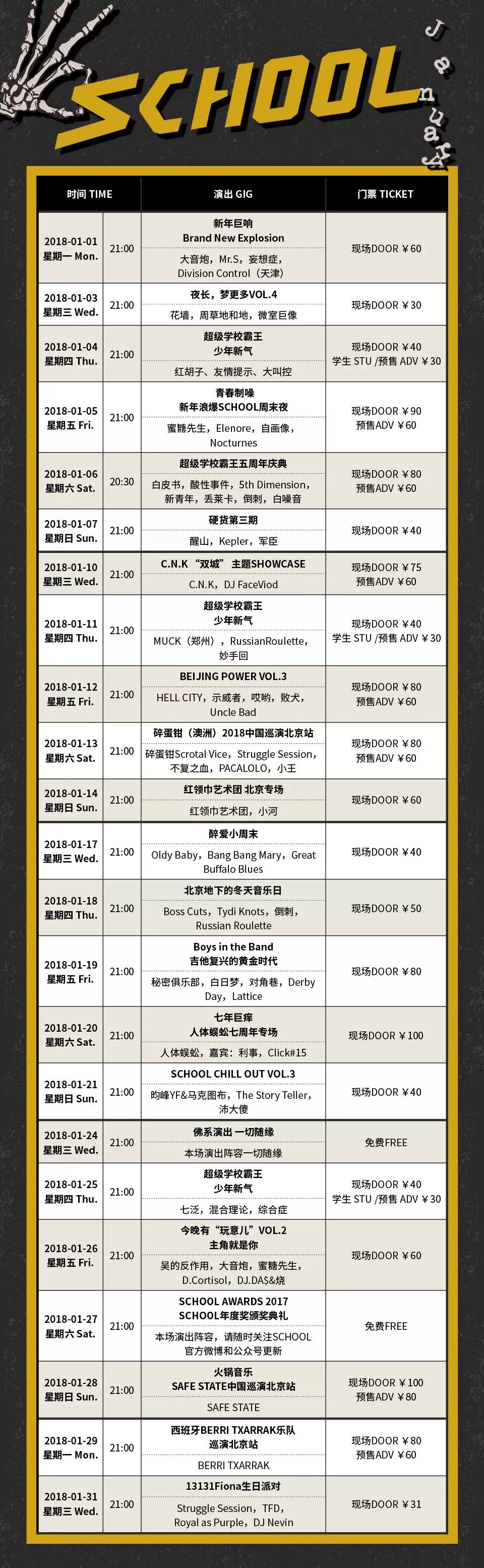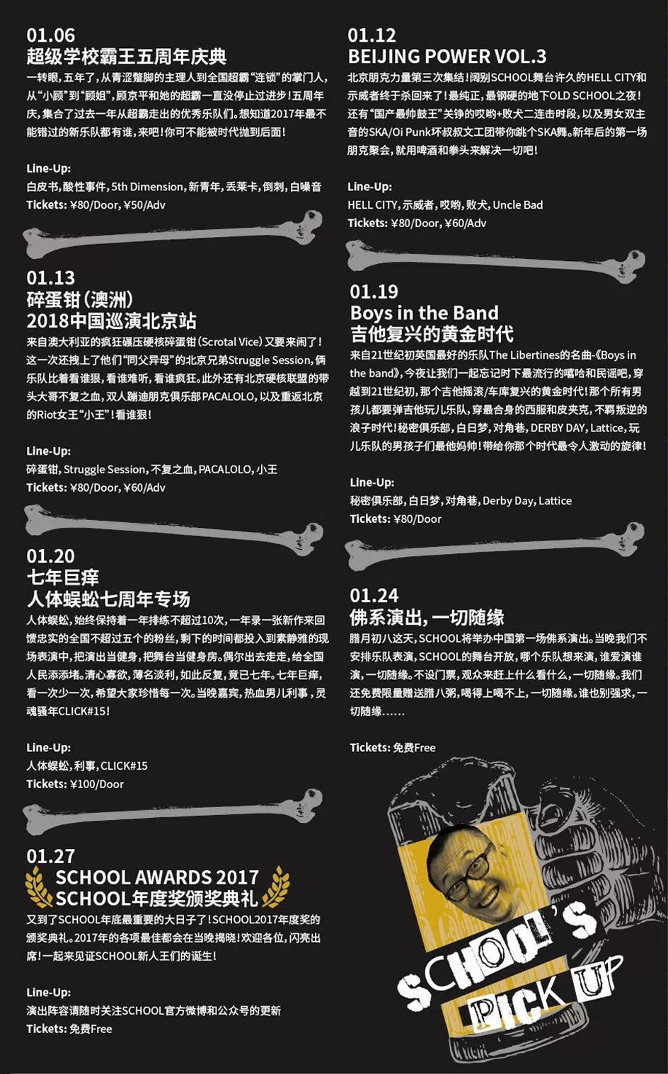 1月课表的封面是1月27号的SCHOOL2017年度颁奖典礼!这可是学校每年的最大事,也是对过去一年间在SCHOOL演出,成长的乐队们的最大鼓励与肯定!具体细则请随时关注我们的公众号。