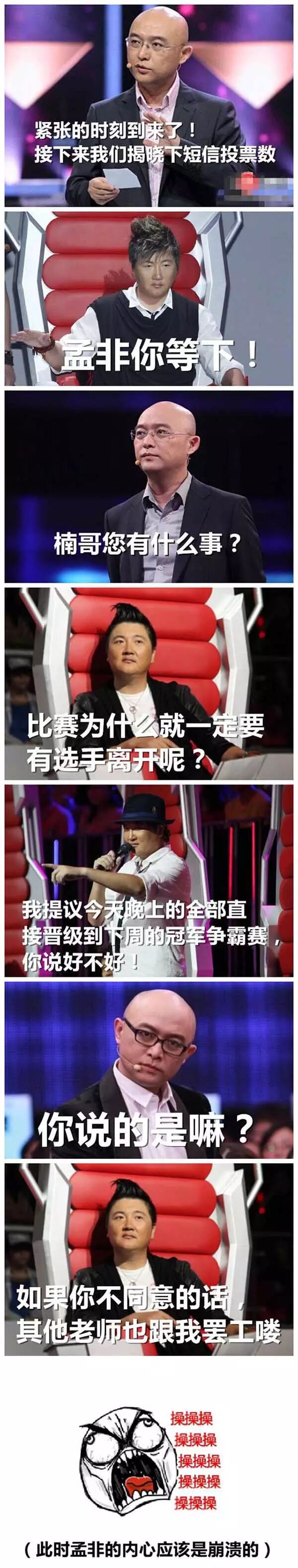 当然最狗血的莫过于孙楠组内淘汰的时候,主持人栗坤几次催促他做决定,孙楠仍在选择器前徘徊不定,最后干脆不顾留在台上的两位学员,走到侧台坐地沉默,导致节目一度停录。