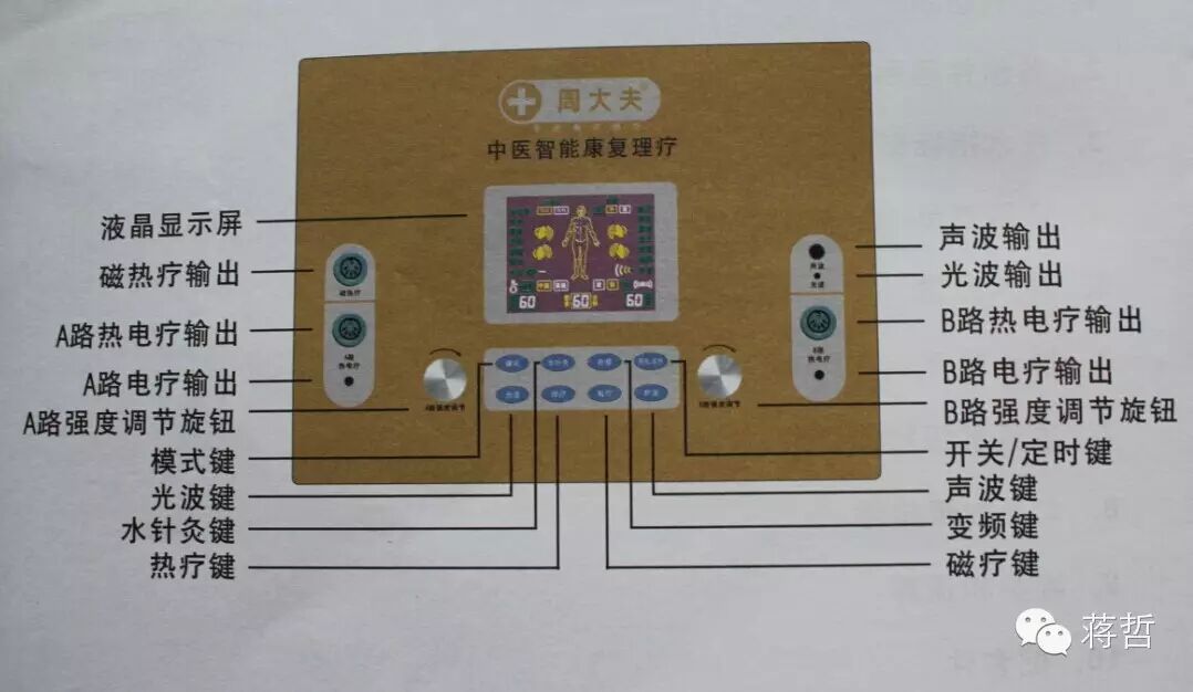 4、水针灸键:可依次循环调节水针灸弱档、水针灸强档,调节时有相应的语音提示。