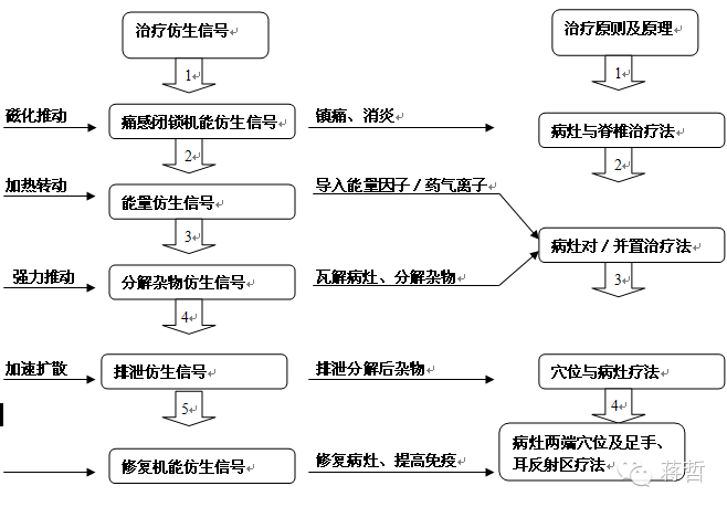 此疗法是把一端电极放置病灶邻近的穴位,另一端电极和磁热疗垫放置病灶,利用治疗仪的排泄仿生信号,把上阶段分解的杂物畅顺排除体外,也可以选用痛点和足底反射区组成一组电极治疗,每天2次,3~4天为一阶段。此阶段有患者可能有痒痛感觉,甚至有像汗水一样排泄物从病灶附件皮肤排出,然后患部皮肤有轻微凹陷,都是康复的一种外在表现。
