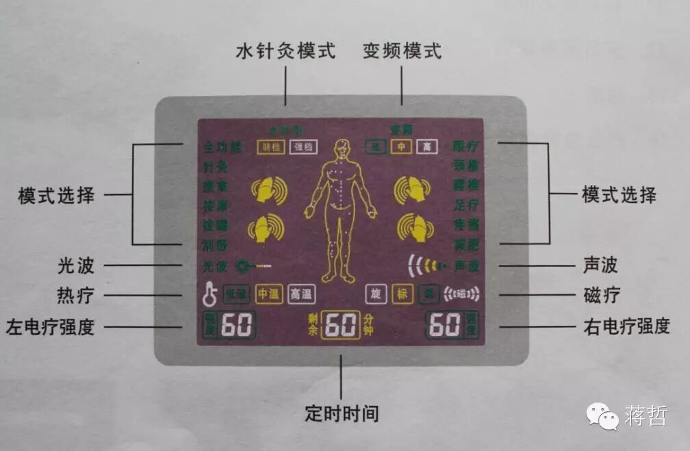 根据不同治疗感觉和治疗频率段,组合出不同治疗程序,分别为水针灸、全功能、针灸、推拿、按摩、拔罐、刮痧、眼疗、颈椎、腰椎、足疗、疼痛、减肥、多种治疗程序,使用时可任意选择。