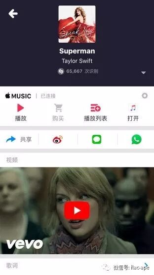 更强大的是,Shazam还能显示每首歌曲所在的专辑/唱片公司/发行时间、视频MV、歌手的其他热门单曲,甚至还附上了歌词。如此详细的信息识别结果,不禁让人感叹Shazam识别技术的成熟和强大(还有对资源的积累和整合)。并且这样一比较也不难发现,国内主流听歌软件里的听歌识曲功能与Shazam还有着非常大的差距。